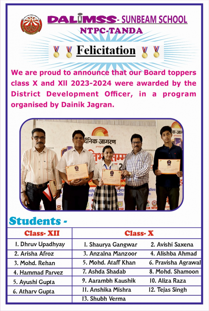 Board toppers class X and Xll 2023-2024 were awarded by the District Development Officer, in a program organised by Dainik Jagran